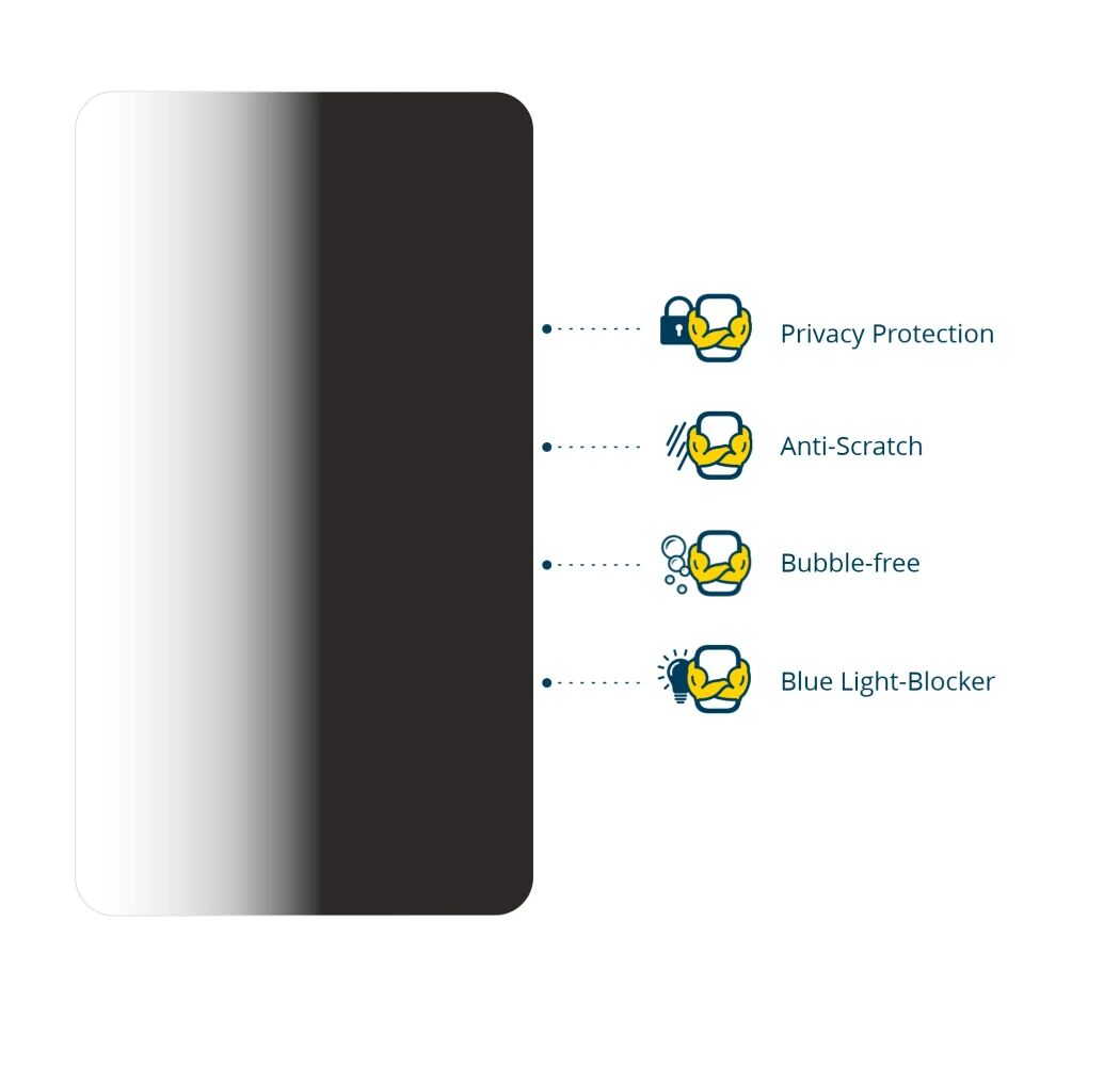 Die Brotect Anti-Spy Displayschutzfolie verhindert ungewollte Blicke von der Seite auf dein Smartphone-Display. Zudem schützt sie den Bildschirm vor Kratzern und Schäden. Der eingebaute Blaulichtfilter reduziert den Anteil blauen Lichts um 35-60% und schont damit deine Augen. Die Folie lässt sich in wenigen Sekunden blasenfrei anbringen – bitte folge dabei der Anleitung und achte auf eine staubfreie Umgebung. Wenn du die Folie nicht mehr brauchst, kannst du sie mühelos entfernen. Made in Germany.